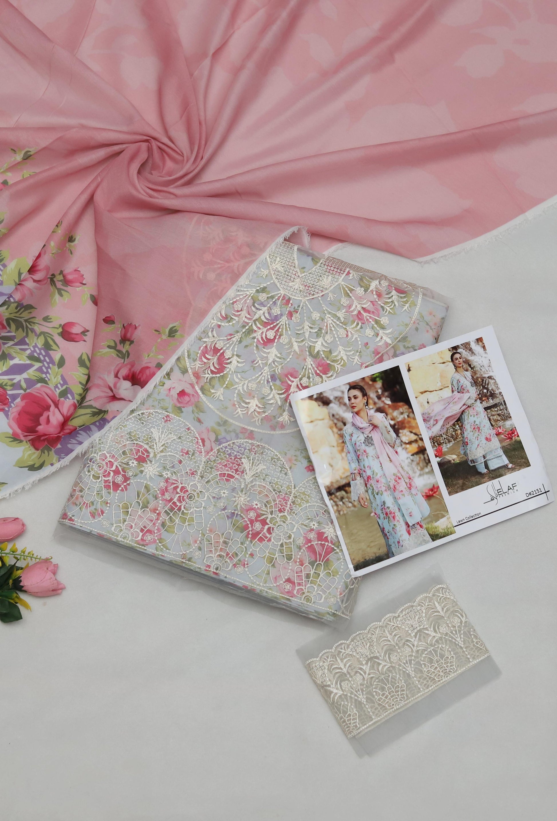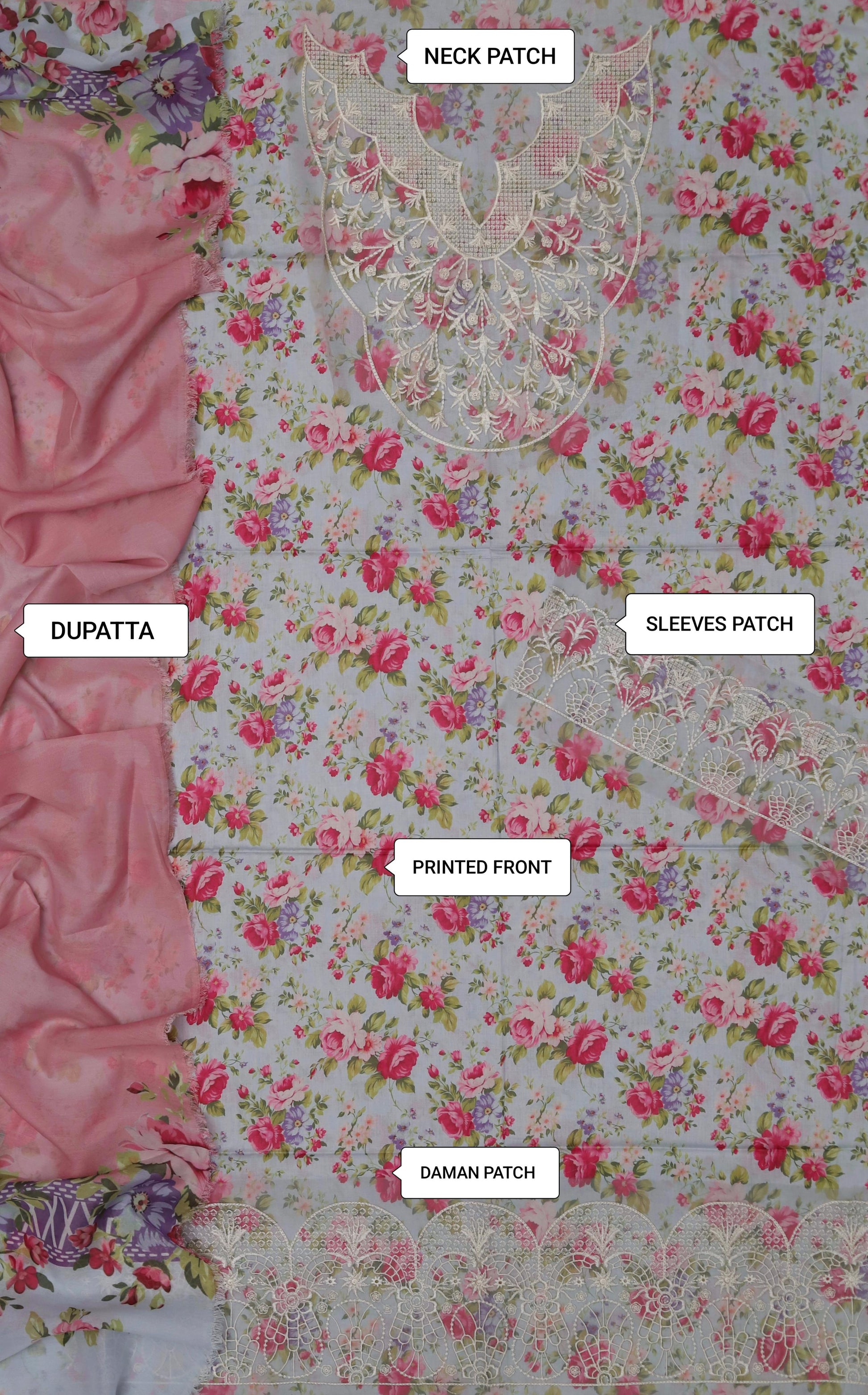 The dupatta is a light pink chiffon or soft lawn fabric.